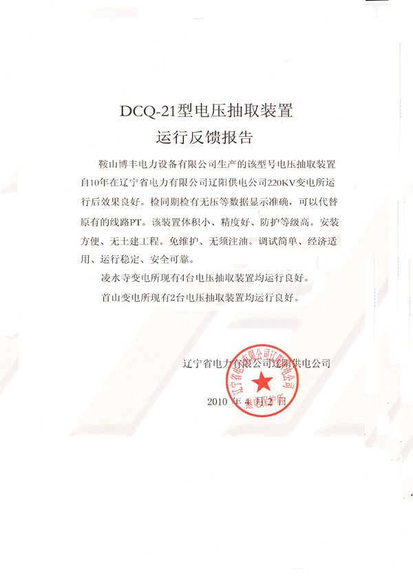 國網(wǎng)黑龍江省電力公司500kvA馮屯變電站維護檢修時更換了8臺由我司生產(chǎn)的DCQ~21型電壓抽取裝置(專利產(chǎn)品)。